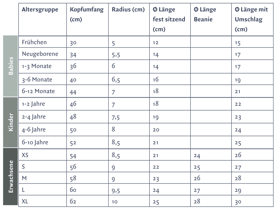 Radiuswerte gelten für einen kreisrunden Boden der Mütze, der gestrickt wird, bevor man zur geraden Seitenpartie übergeht (bei der Top-Down-Mütze). Achte auf die Dehnbarkeit der Wolle – bei elastischen Garnen kann der Radius etwas kleiner sein.