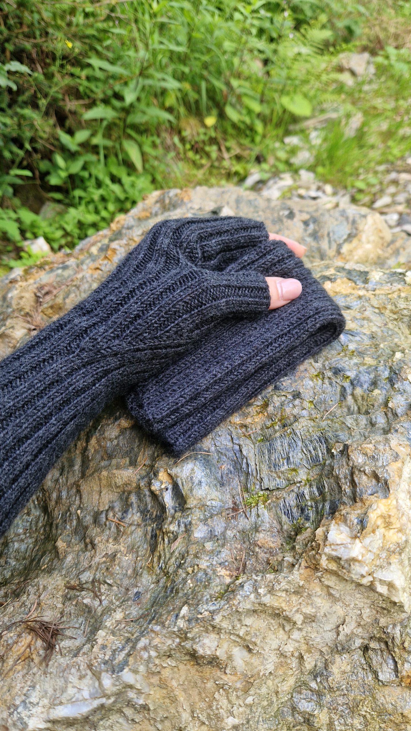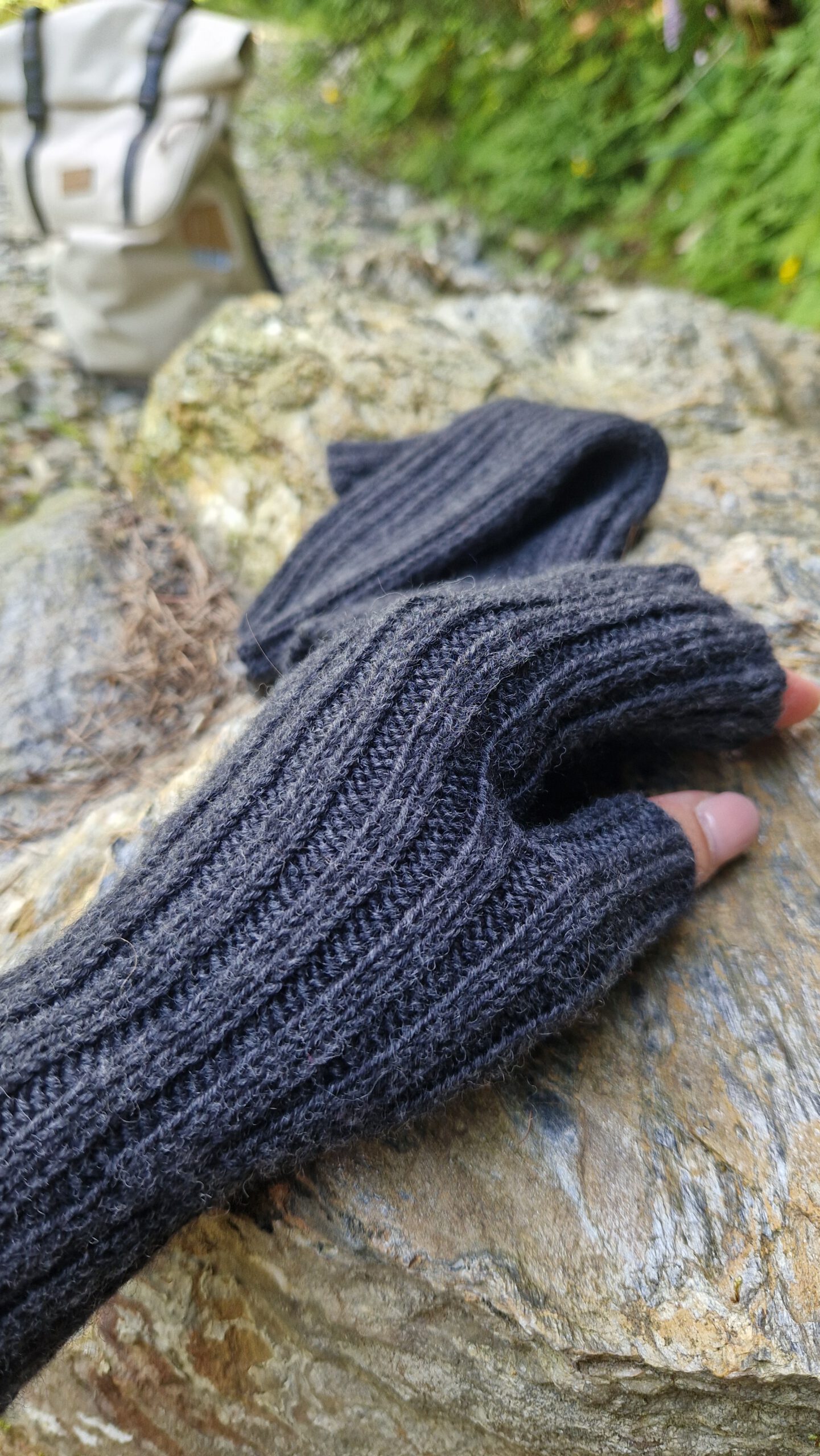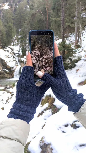 Die Handstulpen werden von der Manschette zu den Fingern im Rippenmuster gestrickt. Durch gezielte Zunahmen an der Seite entsteht ein keilförmiger Einsatz für den Daumen.